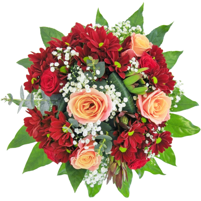 Our Enchanting Pink & Red Floral Arrangement combines the soft hues of sweet peach roses with the boldness of scarlet red roses. Accentuated by deep red spray chrysanthemums, white gypsophila, and enriched with aralia and eucalyptus leaves, this bouquet offers a unique and visually stunning display.